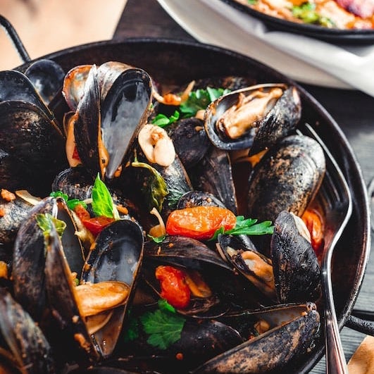Steamed mussels steamed with garlic, with our signature, homemade Pappardelle.